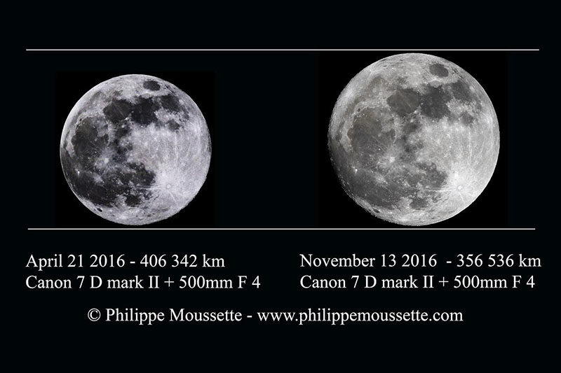 Μία υπερπανσέληνος είναι περίπου 14% μεγαλύτερη (σε διάμετρο) και 30% πιο φωτεινή από μία απλή πανσέληνο που βρίσκεται στο πιο απομακρυσμένο σημείο της απο τη Γη. Ο φωτογράφος Philippe Moussette προκειμένου να δει αυτές τις διαφορές στην πράξη, φωτογράφισε την πανσέληνο δύο φορές με τον ίδιο ακριβώς εξοπλισμό. Μία στις 21 Απριλίου 2016, όταν η πανσέληνος βρισκόταν στην πιο απομακρυσμένη θέση της από τη γη και μία την Δευτέρα 14 Νοεμβρίου 2016 που ήταν στο κοντινότερο.