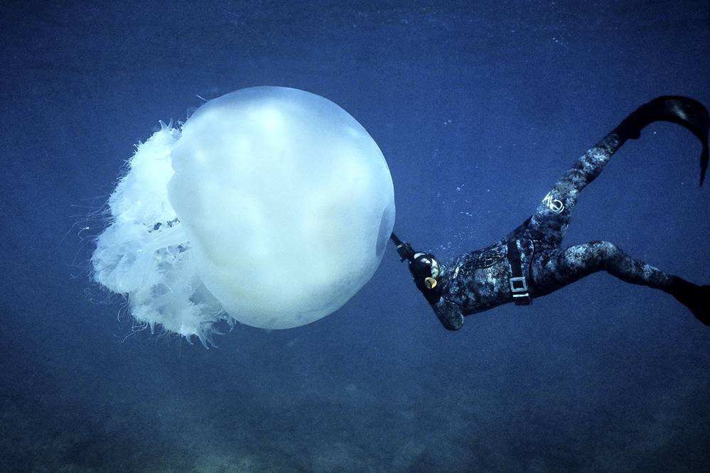 © Ibrahim Chalhoub / AFP: ένας ελεύθερος δύτης κολυμπά κοντά σε μια μεγάλη μέδουσα στα ανοικτά των ακτών της πόλης Μπατρούν (βόρειος Λίβανος, 13 Φεβρουαρίου 2022).