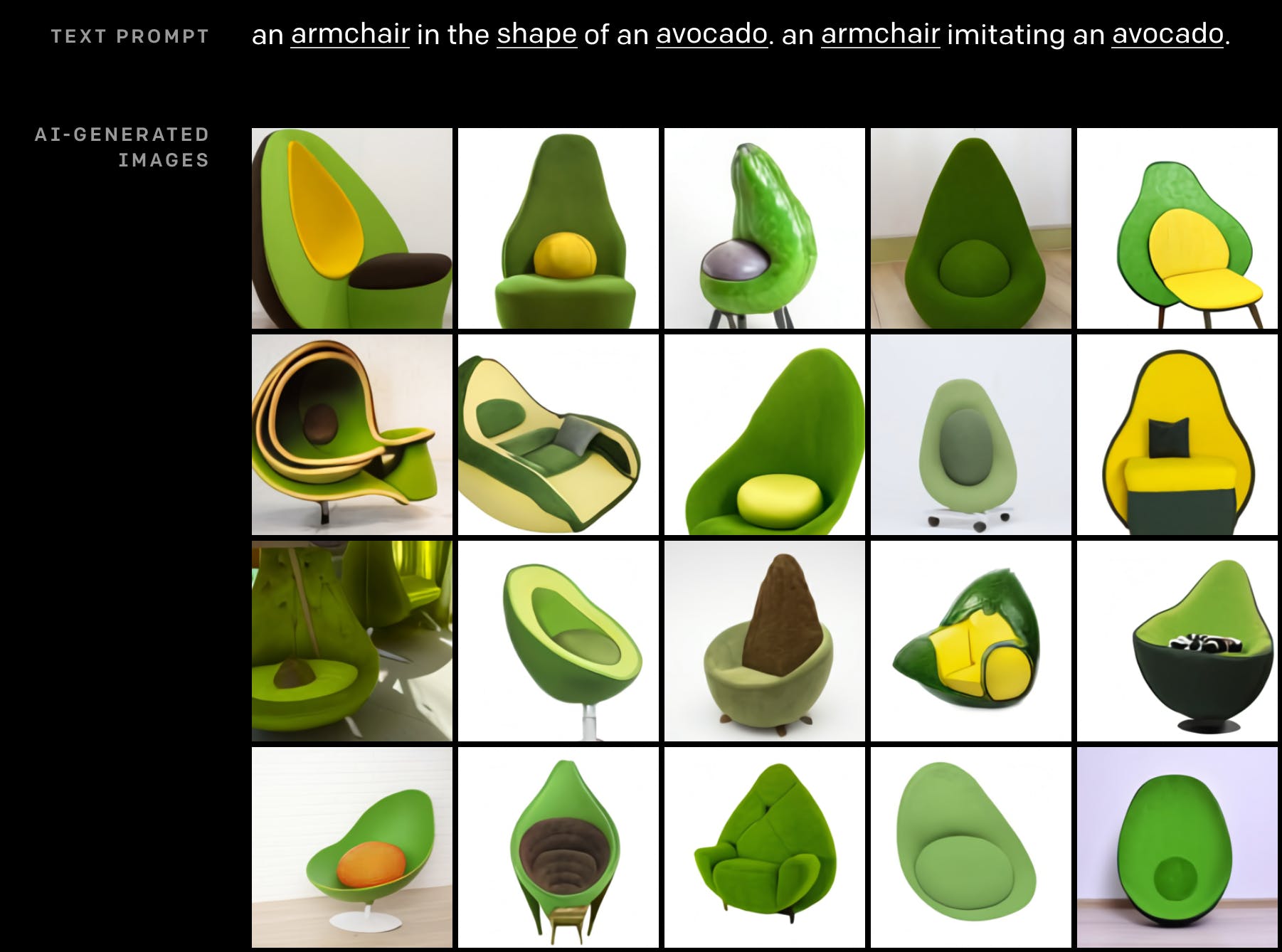 Για παράδειγμα, μπορείτε να γράψετε μια πρόταση που να περιέχει τις λέξεις “καρέκλα” και “αβοκάντο”. Το Dall-e θα αναλάβει να ενώσει τις δύο συνδεδεμένες εικόνες που ξέρει, και θα εξάγει μια εικόνα καρέκλας σε σχήμα και χρώματα αβοκάντο!
