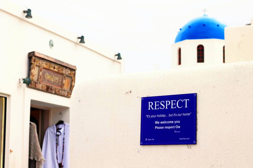 Αυτή η αναζήτηση για την “τέλεια φωτογραφία” προκαλεί πονοκέφαλο στους κατοίκους των πιο πολυσύχναστων σημείων του νησιού. “Οι άνθρωποι συμπεριφέρονται όχι μόνο άσχημα, αλλά απίστευτα,” υπογραμμίζει ο Michael Ermogenis, ένας Ελληνο-Αμερικανός με καριέρα στη διαφήμιση, ο οποίος ζει στη Σαντορίνη τα τελευταία 12 χρόνια. “Οι άνθρωποι αντιμετωπίζουν τις εκκλησίες ως στούντιο για λήψεις selfie” εξηγεί. “Υπάρχει μία μπροστά από το σπίτι μου: οι επισκέπτες χτυπούν την καμπάνα της κάθε τρία λεπτά ή σκαρφαλώνουν στην οροφή της για fake εικόνες γάμου. Έχω ξυπνήσει ακόμα και στις 6 το πρωί, από ανθρώπους που περπατούν καταπατώντας την ταράτσα μου!». Η απογοήτευσή του τον οδήγησε να αρχίσει να κρεμά επιγραφές που θυμίζουν στους επισκέπτες πως «είναι οι διακοπές σας… αλλά είναι το σπίτι μας.» Η φωτογραφία που ακολουθεί είναι χαρακτηριστική!